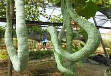 蛇瓜是葫芦科栝楼属的一年生攀援藤本植物。别名蛇豆。茎被柔毛及疏长柔毛状硬毛;叶圆形或肾状圆形,先端圆钝或宽三角形,叶基弯缺深心形;花雌雄同株,苞片钻状披针形,萼筒密被毛,裂片呈窄三角形,花冠白色,…全部>>