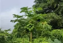 番木瓜,番木瓜科番木瓜属的常绿软木质小乔木,高达10米,具有乳汁;茎不分枝或有时于损伤处分枝;叶大且聚生于茎顶,近似盾形,叶柄中空;花单性或两性,有些品种雄株偶尔生两性花或雌花,…全部>>