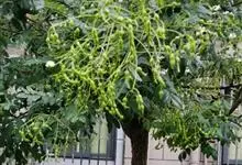 龙爪槐为乔木,高达25米;树皮灰褐色,具纵裂纹。当年生枝绿色,无毛。羽状复叶长达25厘米;叶轴初被疏柔毛,旋即脱净;叶柄基部膨大,包裹着芽。圆锥花序顶生,常呈金字塔形,…全部>>