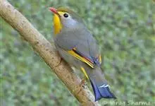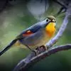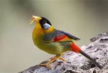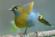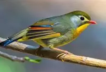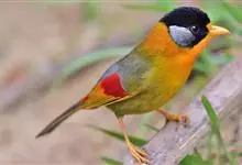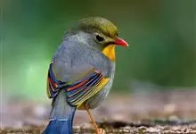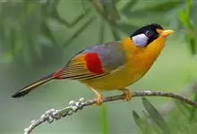 银耳相思鸟小型鸟类,体长14~18厘米。头顶黑色,耳羽银灰色,前额橙黄色;外侧飞羽橙黄色,基部朱红色,极为鲜艳、醒目。尾圆形,尾上、尾下覆羽朱红色,尾暗灰褐色,外侧尾羽橙黄色,其余上体橄榄绿或橄榄黄色。…全部>>