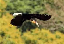花冠皱盔犀鸟雄鸟体长约105厘米,雌鸟较小。尾白,雄雌两性的背、两翼及腹部均为黑色,但雄鸟头部奶白色,枕部具略红的丝状羽,裸出的喉囊上具明显的黑色条纹。雌鸟头颈黑,喉囊蓝色。成对或小群飞于森林上空,…全部>>
