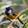 金胸雀鹛是莺科、雀鹛属小型鸟类,体长10-11厘米。头黑色,头顶中央有一道白色中央冠纹,颊和耳羽亦为白色,在黑色的头部极为醒目。上体深灰沾绿。两翅黑色,外侧飞羽有黄色外缘和白色端斑;尾凸状、黑色。…全部>>