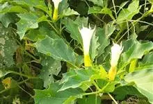 曼陀罗,茄科曼陀罗属一年生大型草本植物,全株光滑。有臭气;叶呈广卯形,边缘具不规则波状浅齿裂;花单生于枝杖间或叶腋,直立,有短梗;花萼是筒状裂片三角形,颜色为白色或淡紫色;果实为蒴果卵状,…全部>>