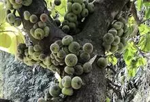 大果榕是桑科榕属的小乔木,株高可达10米;幼枝被柔毛;叶互生,宽卵状心形或近圆形;雄花无梗、匙形、花丝长,雌花生于雌株榕果内,子房白色;榕果簇生于树干基部或老茎短枝上、扁球形或陀螺形,…全部>>