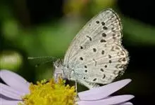 蚜灰蝶又名棋石灰蝶,Taraka hamada Druce,灰蝶科蚜灰蝶属。体小形,翅展22-26mm。翅黑褐色,无斑纹,缘毛黑白相间。 反面白色,前后翅各散布20余个黑斑,翅中央黑斑较大,排成不规…全部>>