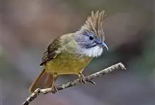 白喉冠鹎:体长20-25厘米。头顶红褐色,有长而细的羽冠、红褐色,头侧灰色。上体橄榄绿黄色,飞羽暗褐色,外翈茶黄色,尾下覆羽皮黄色。…全部>>