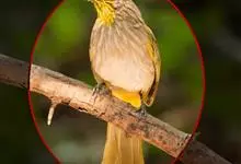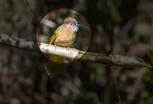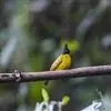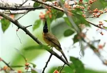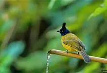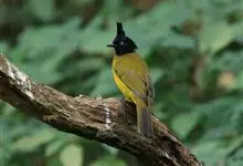 黑冠黄鹎:体长18-21厘米,是一种中等体型偏黄色鹎。整个头、颈、颏、喉黑色,头顶有显著直立的羽冠,黑色,上体褐橄榄黄绿色,下体橄榄黄色。虹膜偏红;嘴及脚黑色。…全部>>