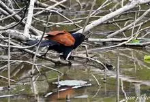 褐翅鸦鹃,是鹃形目鸦鹃科鸦鹃属的鸟类。褐翅鸦鹃的身体为黑色;头颈和胸带蓝紫色金属光泽并具黑亮的羽干纹,下胸至腹部泛金属绿光泽;两翼和肩部为棕栗色,外侧飞羽具暗色羽端,尾羽闪铜绿色光泽;虹膜赤红色,…全部>>