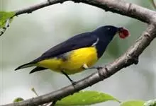 黄腹啄花鸟:体重11-16克,体长104-117毫米。是一种体型大,下腹部为艳黄色的啄花鸟,雄鸟特征为头黑色,喉部有白色纵斑、喉侧及上体成对比,两翅和尾黑色,外侧尾羽内翈具白色斑块。其余下体淡黄色。…全部>>