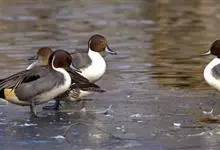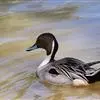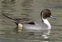 针尾鸭,是雁形目鸭科鸭属动物。体长约75厘米的大型戏水鸭,雄鸟头暗褐色,颈侧有白色纹路,向下与胸部白色相连,中央一对尾羽特别长;背灰色,有黑色细纹;翼镜绿色,胸腹白色,尾下覆羽黑色;雌鸟体羽大致为褐色,…全部>>