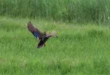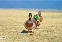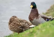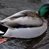 绿头鸭属游禽,大型鸭类。体长47-62厘米,体重大约1千克,外形大小和家鸭相似。雄鸟嘴黄绿色,脚橙黄色,头和颈辉绿色,颈部有一明显的白色领环。上体黑褐色,腰和尾上覆羽黑色,两对中央尾羽亦为黑色,且向…全部>>