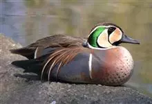 绿翅鸭是小型鸭类,体长37厘米,体重约0.5千克。嘴脚均为黑色。雄鸟头至颈部深栗色,头顶两侧从眼开始有一条宽阔的绿色带斑一直延伸至颈侧,尾下覆羽黑色,两侧各有一黄色三角形斑,在水中游泳时,极为醒目。…全部>>