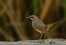 红点颏:是鸟纲、鹟科的鸣禽。又名西伯利亚歌鸲。体长14-17厘米,体重16-27克。雄鸟头部、上体主要为橄榄褐色。眉纹白色。颏部、喉部红色,周围有黑色狭纹。胸部灰色,腹部白色。雌鸟颏部、喉部不呈赤红色,…全部>>