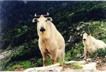 羚牛,偶蹄目牛科羚牛属哺乳动物,俗称扭角羚、野山牛、盘羊。其体形粗壮。尾短。吻鼻部隆起且裸露。前额隆起,毛短而蓬松。角基粗,由头顶长出后先向上升起,又突然翻转,靠近头部,复向外伸,然后又向后弯转,…全部>>