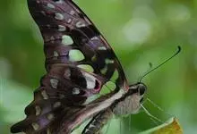 青带凤蝶Graphium sarpedon ,又名青凤蝶,是最普遍的中型凤蝶,飞行速度很快。青带凤蝶的翅膀中央有许多浅蓝色的斑点,很整齐地排列成一条直线。这些斑点由上而下逐渐变大,就像一条青色的带子。全部>>