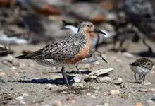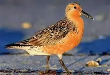 红腹滨鹬,是鹬科、滨鹬属的小型涉禽,体长23-25厘米,嘴较短而直、黑色,脚亦甚短、绿色。体较粗胖。夏季上体灰褐色具黑色中央纹,背具棕栗色和白色斑纹和羽缘,头侧和整个下体栗红色。冬季棕红色消失,…全部>>