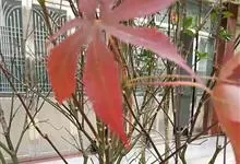 鸡爪槭是无患子科槭属的落叶小乔木,又名红槭树、枫叶、鸡爪枫。全株高2-5m;树皮深灰色,树冠伞形;枝条开张,细弱,当年生枝紫色或淡紫绿色,多年生枝淡灰紫色或深紫色;叶纸质,外貌圆形,上面深绿色无毛,…全部>>