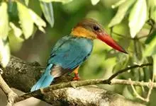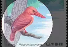 鹳嘴翡翠:体长33-37厘米。体重140-200克。共有13个亚种,体型大,嘴形巨大、侧扁,似鹳嘴,红色,嘴峰两侧有鼻沟。头灰褐色,上体蓝色,下体和宽阔的领环赭土色,脚红色。飞翔时翅上无斑。全部>>