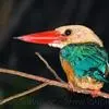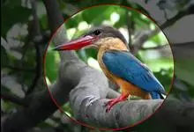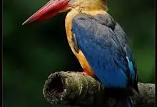 鹳嘴翡翠:体长33-37厘米。体重140-200克。共有13个亚种,体型大,嘴形巨大、侧扁,似鹳嘴,红色,嘴峰两侧有鼻沟。头灰褐色,上体蓝色,下体和宽阔的领环赭土色,脚红色。飞翔时翅上无斑。全部>>