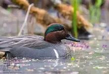 绿翅鸭是小型鸭类,体长37厘米,体重约0.5千克。嘴脚均为黑色。雄鸟头至颈部深栗色,头顶两侧从眼开始有一条宽阔的绿色带斑一直延伸至颈侧,尾下覆羽黑色,两侧各有一黄色三角形斑,在水中游泳时,极为醒目。…全部>>
