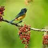 棕腹大仙鹟:体重24-28克,体长15-17厘米,是一种小型的色彩亮丽的鹟。雄鸟上体深蓝,下体棕色,脸黑,额、颈侧小块斑、翼角及腰部亮丽闪辉蓝色。与棕腹仙鹟易混淆,区别在色彩较暗。雌鸟灰褐,…全部>>