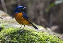 棕腹蓝仙鹟,Niltava vivida,鹟科仙鹟属的一种小型鸣禽,善在空中飞捕昆虫,中等体型18厘米,上体蓝,下体棕色,具黑色眼罩,胸橘黄渐变成臀部的皮黄色。国内分布于四川、云南、西藏和台湾等地。…全部>>