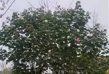 木芙蓉,锦葵科木槿属落叶灌木或小乔木。小枝上有细绒毛;叶片为卵状心形,托叶为披针形,常早落;花单生,花萼为钟形,花冠初为白色或淡红色,后逐渐变为深红色;果实为扁球形,有淡黄色的毛附着。花期8到10月。…全部>>