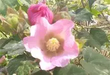 木芙蓉,锦葵科木槿属落叶灌木或小乔木。小枝上有细绒毛;叶片为卵状心形,托叶为披针形,常早落;花单生,花萼为钟形,花冠初为白色或淡红色,后逐渐变为深红色;果实为扁球形,有淡黄色的毛附着。花期8到10月。…全部>>