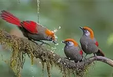 赤尾噪鹛中型鸟类,体长24~28厘米。头顶至后颈红棕色,两翅和尾鲜红色,眼先、眉纹、颊、颏和喉黑色,眼后有一灰色块斑。其余上下体羽大都暗灰或橄榄灰色。特征极明显,特别是通过鲜红色的头顶、翅和尾。…全部>>