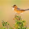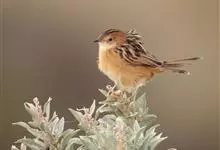 金头扇尾莺体小而具褐色纵纹的莺。嘴细长,略向下弯;翼短,体型娇小,尾长。下体皮黄,喉近白,尾深褐,尾端皮黄。雌雄羽色相近,羽色单调。繁殖期雄鸟顶冠亮金色,腰褐色。雌鸟及非繁殖期雄鸟头顶密布黑色细纹,…全部>>