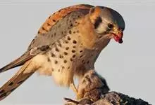 红隼:是隼科、隼属的小型猛禽之一。体重173-335克,体长305-360毫米。翅狭长而尖,尾亦较长,外形和共同爪隼非常相似。雄鸟头蓝灰色,背和翅上覆羽砖红色,具三角形黑斑;腰、尾上覆羽和尾羽蓝灰色,…全部>>