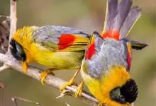 黄颈拟蜡嘴雀:小型鸟类,体长20-22厘米。嘴粗大,黑色。雄鸟整个头、颈、颏、喉和上胸辉黑色,两翅和尾亦为黑色,其余上体橙黄色,下体鲜黄色。雌鸟头、颈、颏、喉和上胸中央灰色或暗灰色,…全部>>
