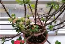 虎刺梅:别称铁海棠,是蔓生灌木植物。茎多分枝,长60-100厘米,直径5-10毫米,具纵棱,密生硬而尖的锥状刺,刺长1-1.5厘米,直径0.5-1.0 毫米,常呈3-5列排列于棱脊上,呈旋转。叶互生…全部>>
