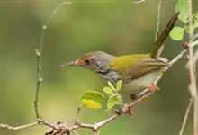 普通缝叶莺,是雀形目鹅科莺亚科缝叶莺属一种。体长10-14厘米,体重7-10克,雄鸟前额棕红,头顶至枕棕橄榄褐,上体橄榄绿染黄,飞羽及尾羽暗褐;繁殖期雄鸟的中央尾羽特形延长,下体淡皮黄白色。…全部>>
