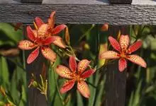 射干 Redouté)是鸢尾科射干属多年生草本植物。根状茎为不规则的块状,斜黄色或黄褐色;花橙红色,散生紫褐色的斑点;花药呈条形;子房下位,倒卵形;蒴果倒卵形或长椭圆形;种子圆球形,黑紫色,有光泽。…全部>>