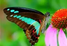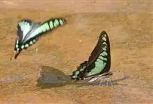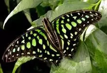 青带凤蝶Graphium sarpedon ,又名青凤蝶,是最普遍的中型凤蝶,飞行速度很快。青带凤蝶的翅膀中央有许多浅蓝色的斑点,很整齐地排列成一条直线。这些斑点由上而下逐渐变大,就像一条青色的带子。全部>>