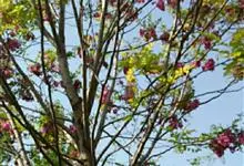 红花刺槐是豆科刺槐属的植物。其干皮深纵裂;枝具托叶刺,羽状复叶互生,叶片卵形或长圆形,具芒尖;基部圆形。花两性;总花序下垂;花冠粉红色,芳香;果条状长圆形,腹缝有窄翅。花期4~5月,果期9~10月。…全部>>