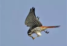 红隼:是隼科、隼属的小型猛禽之一。体重173-335克,体长305-360毫米。翅狭长而尖,尾亦较长,外形和共同爪隼非常相似。雄鸟头蓝灰色,背和翅上覆羽砖红色,具三角形黑斑;腰、尾上覆羽和尾羽蓝灰色,…全部>>