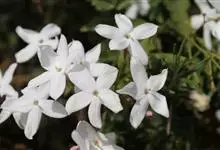 素馨花,木犀科素馨属多年生的攀援灌木植物。攀援灌木,小枝圆柱形,具棱或沟;叶对生,叶轴常具窄翼,小叶片卵形或长卵形;聚伞花序顶生或腋生,花序梗长,苞片线形,花萼无毛,裂片锥状线形,花冠白色,…全部>>