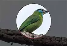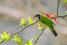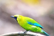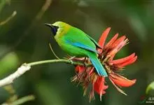 蓝翅叶鹎:小型鸟类,体长15-18厘米。雄鸟通体草绿色,尾蓝绿色,肩和翅亮蓝 色,胸缀有黄色,颏、喉黑色。雌鸟颏,喉蓝绿色。栖息在海拔1500米以下的常绿阔叶林、次生林和林缘疏林灌丛中。…全部>>