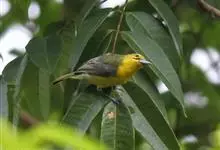 橙腹叶鹎体形大小和金额叶鹎相似,体长16~20厘米。额至后颈黄绿色,其余上体绿色,小覆羽亮钴蓝色,形成明显的肩斑。颏、喉、上胸黑色具钴蓝色髭纹,其余下体橙色。飞羽和尾羽雄鸟黑色、雌鸟绿色。…全部>>