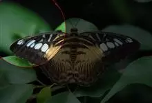 大二尾蛱蝶两翅正面黑色,中域有一浅绿色大型宽带纹,两翅反面浅绿色,中域有一缀黑边的褐色弧纹,亚外缘还有一深褐色横纹,后翅各有尾突两条,…全部>>