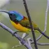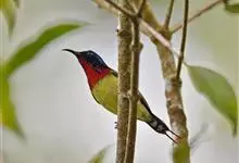 绿喉太阳鸟:共有9个亚种。小型鸟类,雄鸟体长13-15厘米、雌鸟10-12厘米。雄鸟前额至后颈、颏和喉辉绿色,头侧黑色,颈侧和背暗红色,两肩、下背橄榄绿色,腰鲜黄色,尾上覆羽和中央尾羽暗绿色,…全部>>
