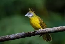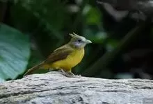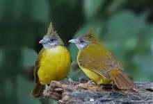 黄腹冠鹎:体长19-24厘米,是一种体型略大的褐色鹎。头顶橄榄褐色具黑褐色羽冠。白色的喉膨起,下体黄色。似白喉冠鹎但较鲜亮,上体褐色较重,腹部为鲜亮的柠檬黄色。虹膜褐色;嘴黑色;脚粉红色。…全部>>