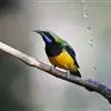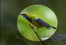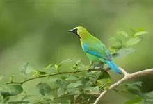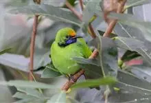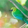 蓝翅叶鹎:小型鸟类,体长15-18厘米。雄鸟通体草绿色,尾蓝绿色,肩和翅亮蓝 色,胸缀有黄色,颏、喉黑色。雌鸟颏,喉蓝绿色。栖息在海拔1500米以下的常绿阔叶林、次生林和林缘疏林灌丛中。…全部>>