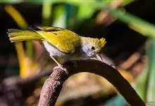 白腹凤鹛是绿鹃科、绿凤鹛属的小型鸟类,体长10-12厘米。上体从头到尾黄绿色,有短的羽冠,头顶微具黑色羽轴纹;眼先、眼周,耳羽和下体灰白色,尾下覆羽黄色。虹膜褐色或红褐色,上嘴浅褐色或肉褐色,…全部>>