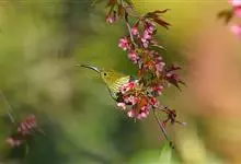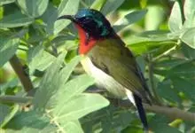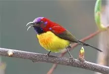 绿喉太阳鸟:共有9个亚种。小型鸟类,雄鸟体长13-15厘米、雌鸟10-12厘米。雄鸟前额至后颈、颏和喉辉绿色,头侧黑色,颈侧和背暗红色,两肩、下背橄榄绿色,腰鲜黄色,尾上覆羽和中央尾羽暗绿色,…全部>>
