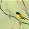 黄腹花蜜鸟是雀形目太阳鸟科花蜜鸟属鸟类。体型较小、喙略短而弯、腹部黄色。雄鸟繁殖季节颏及胸黑紫色并泛金属光泽,具有绯红色及灰色胸带,将上腹部黑色斑与前胸隔开,肩斑为橙黄色丝质羽,上体橄榄绿色,…全部>>