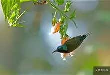 叉尾太阳鸟,雀形目太阳鸟科太阳鸟属留鸟;为小型鸟类,雄鸟头顶辉蓝绿色,上体橄榄绿色,腰明黄色,中央尾羽亮翠蓝色,羽轴针状延长,外侧尾羽黑色具白色端斑,头侧黑色,颜、喉和胸为绛红色,…全部>>