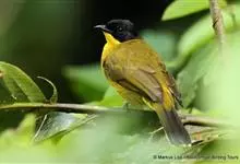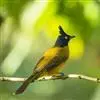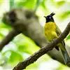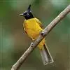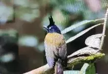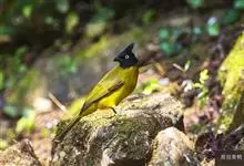 黑冠黄鹎:体长18-21厘米,是一种中等体型偏黄色鹎。整个头、颈、颏、喉黑色,头顶有显著直立的羽冠,黑色,上体褐橄榄黄绿色,下体橄榄黄色。虹膜偏红;嘴及脚黑色。…全部>>